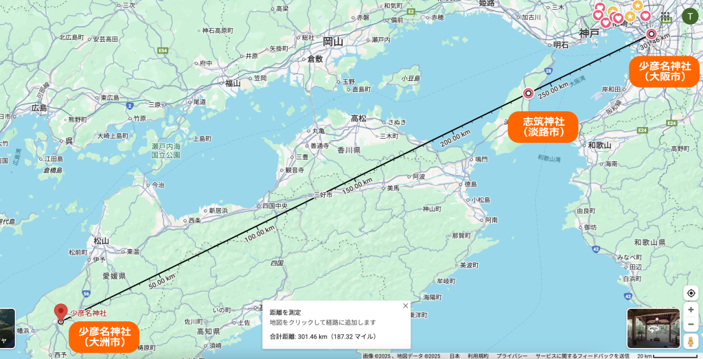 後日、志筑神社の位置から、大洲の少彦名神社との位置関係を想像した時に、ひょっとしてレイラインが存在するのでは?と気になり、地図で線を引っ張ると、なんと、大洲の少彦名神社と志筑神社の延長線上に、大阪の少彦名神社が存在することを発見しました。