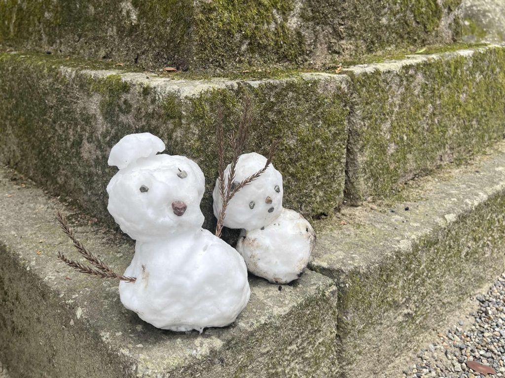 石上神宮ではどなたが作られたのか、かわいい雪だるまを見つけました。いずれ溶けゆく儚い雪だるまに、作った人の優しさを感じ、心が温かくなりました。